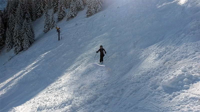 Was sag ich? Genial hoch drei! Alle Pisten 30-50cm mit pulvrigem Neuschnee überzogen und auf manchen Abfahrten nur die Spur vom Liftler vor mir. Der Schnee staubt einem hoch bis zur Hüfte, man schwebt lautlos dahin, gleitet ohne Wartezeit von Lift zu Lift, von Piste zu Piste, bis ... ja bis so ab halb elf die Horden der restlichen Skifahrer aus den Betten kriechen, die Pisten bevölkern und brav oder besser gesagt "stur" den ausgefahrenen Spuren der Frühskifahrer folgen.