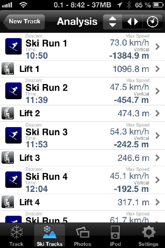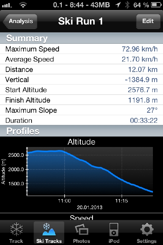 Skitracks habe ich mal ausprobiert, aber die Genauigkeit scheint mir eher fraglich zu sein. Wenn man es wirklich laufen lässt, ist man auf einmal 10 KM/H langsamer in der Topspeed, als da wo man es auf der gleichen Piste hat ruhiger angehen lassen. Die Höhenangaben schienen aber recht genau zu sein, wenn man es mit den Angaben auf den Schildern verglichen hat, war die Abweichung maximal 2-3 Meter.