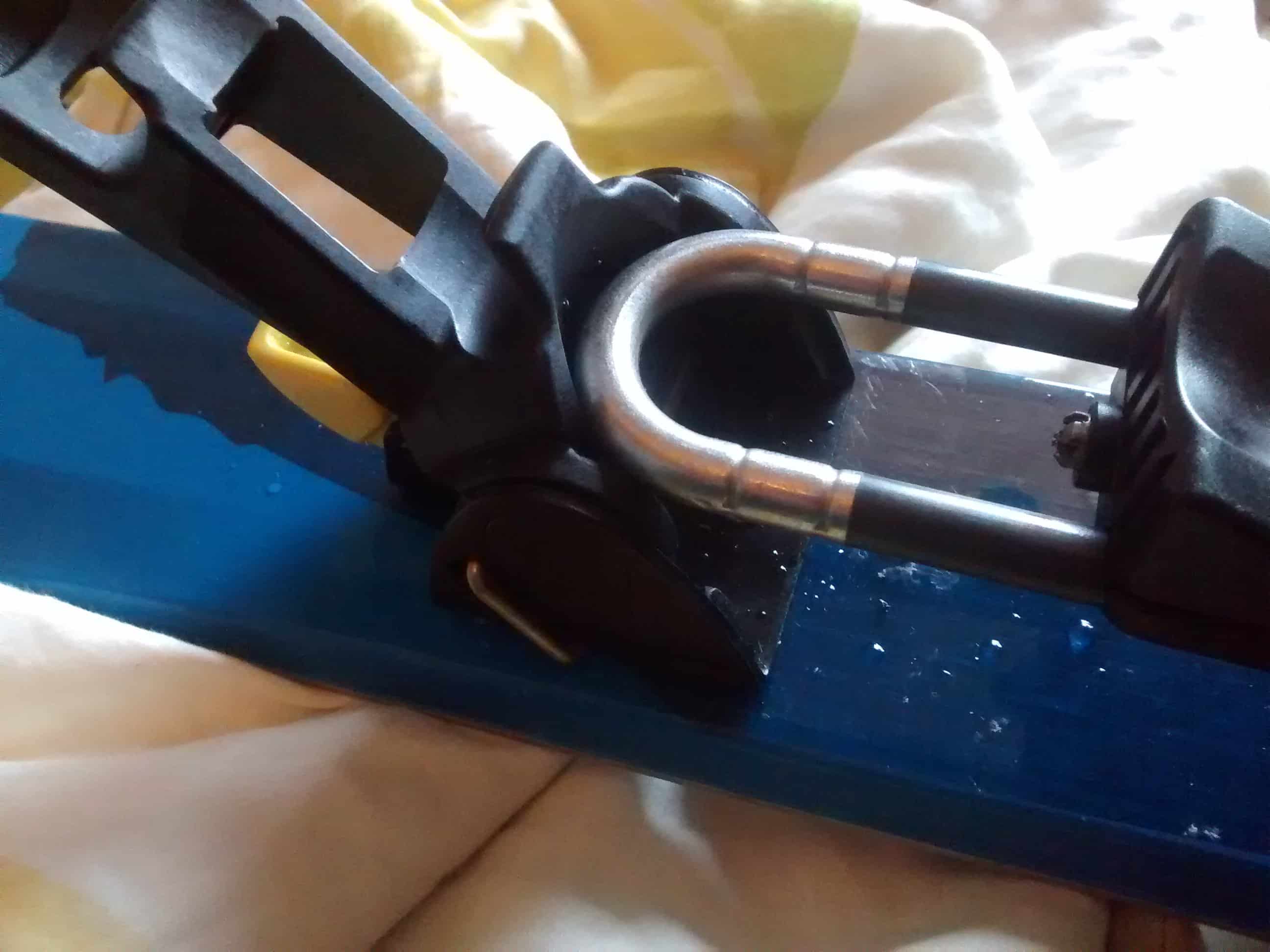 Ich habe zwei Fotos angehängt, eins von der Beule, das andere ist der Rahmen (Vom Vorderteil der Bindung) der so schräg dann hinten reinschleift.