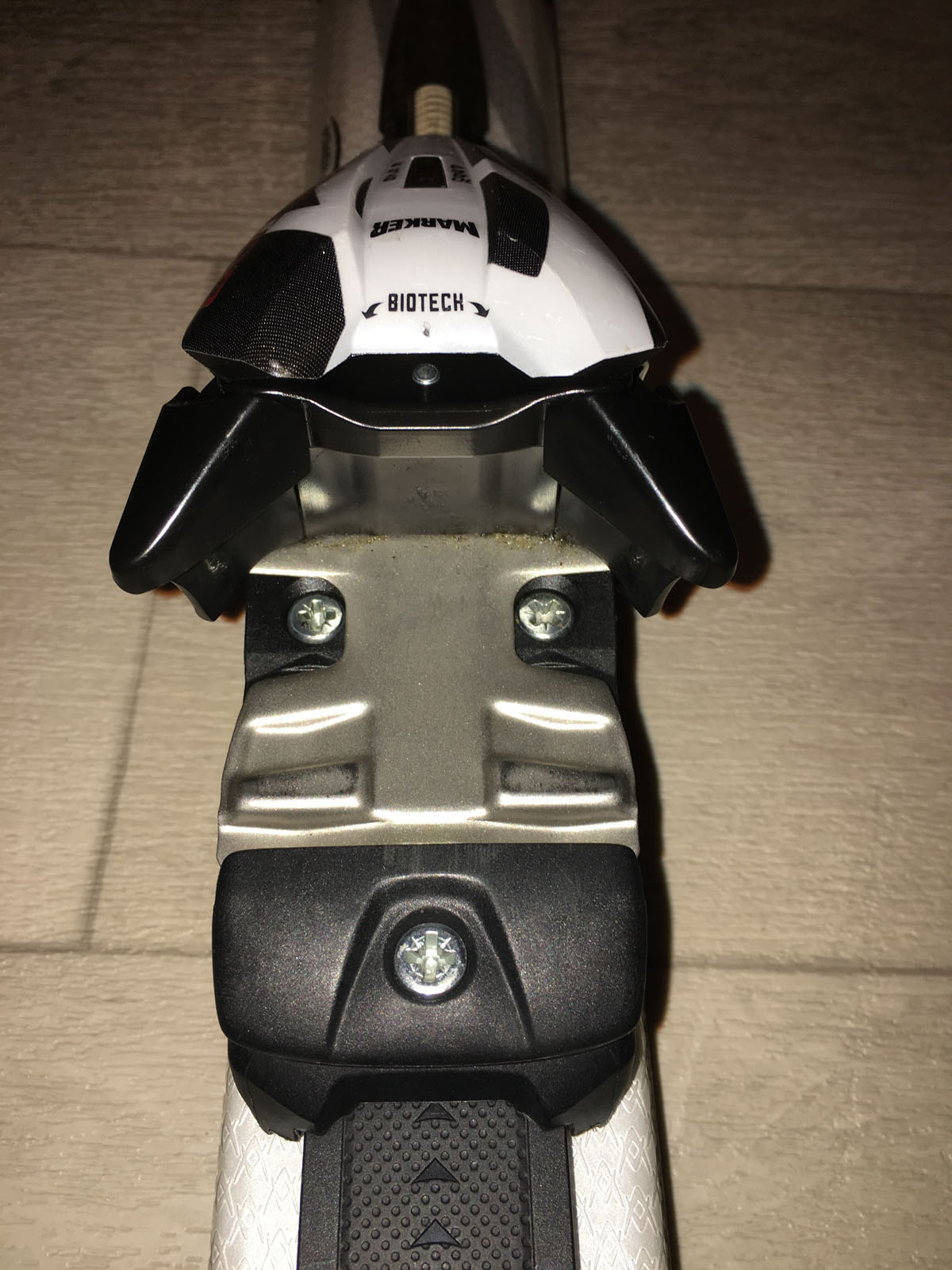 Ich habe nochmal versucht alle Details der Paarung fotografisch zu dokumentieren. Auf dem Foto habe ich die Bindung alleine abfotografiert. Ich weiß nicht ob man diese auch vorne verstellen kann, jedoch hat die Bindung vorne an der Nase nur eine Schraube für den Z-Wert, die Funktion der anderen 3 auf dem Ski kenne ich nicht. Die Verstellschraube hinten ist definitiv bis zum Anschlag herausgedreht. Auf einem der Fotos ist zu sehen wie der Ski in diesem Zustand hinten aufsetzt. Ist dies soweit ok? Der Ski geht auch so mit normalem Druck in die Bindung. Nach dem der Schuh in der Bindung ist, ist die Verstellschraube ca. 2-3mm im Gehäuse und kann dann nochmal ca. eine halbe Umdrehung hineingedreht werden.