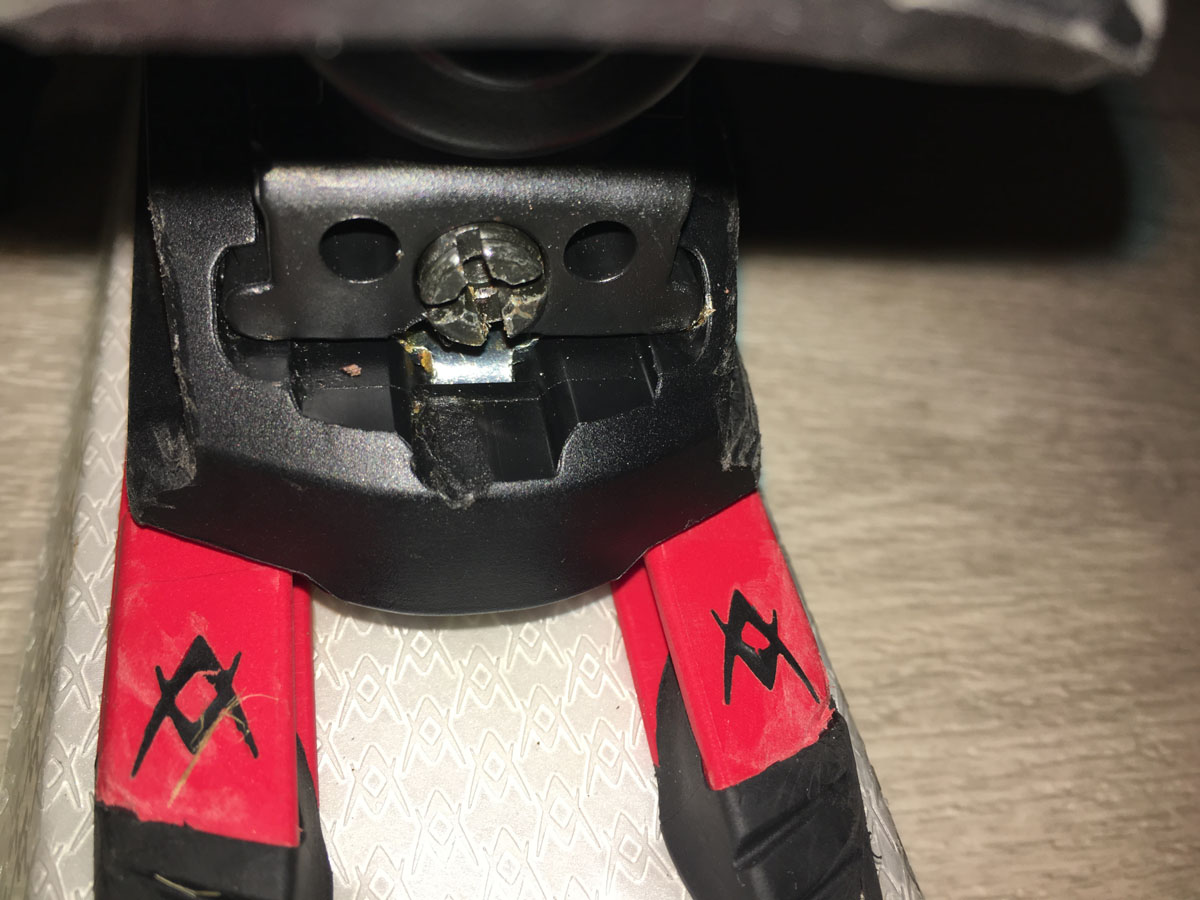 Auf Bild 1, die untere Schraube, diese muss bei eingedrücktem Schuh mit dem Rahmen der Bindung bündig sein.