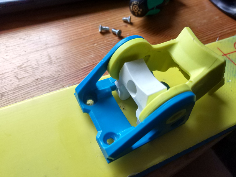 ich habe mir letzten Winter einen Tourenski mit einer Tyrolia Ambtion 12 Bindung gekauft. Blöderweise ist bei der 5ten Tour am Feststellmechanismus ein Teil gebrochen, weshalb die Bindung nicht mehr festgestellt werden kann zum Abfahren. Auf den folgenden Bildern kann man das kaputte Teil sehen (das ist das Teil von der noch intakten Bindung):
