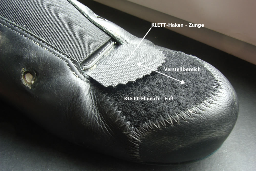 Was du machen könntest wäre, die Zunge vorne an den Zehen etwas weiter vor zu machen, damit sie UNTEN am Schienbein weiter vor kommt und so gleichmäßiger am gesamten Schienbein anliegt. Such dir einen Schuhmacher, der dir die Zunge vorne abschneidet und mit Klett verlängert (siehe Bild). So hast du 1, 2, 3 cm Spielraum: Weiter könntest du darauf achten, dass das Klettband oben am Skischuhschaft vorne NICHT ÜBER der Plastikschale zugezogen wird, sondern darunter; also den Innenschuh direkt umschließt. Auch so bekommst du den Innenschuh / die Zunge gleichmäßiger an das Schienbein ran.huckleberry hat geschrieben:ne..eher weiter unten ..fast schon in der "kehle" zwischen schienbein und fuss..ca. 5cm darüber!