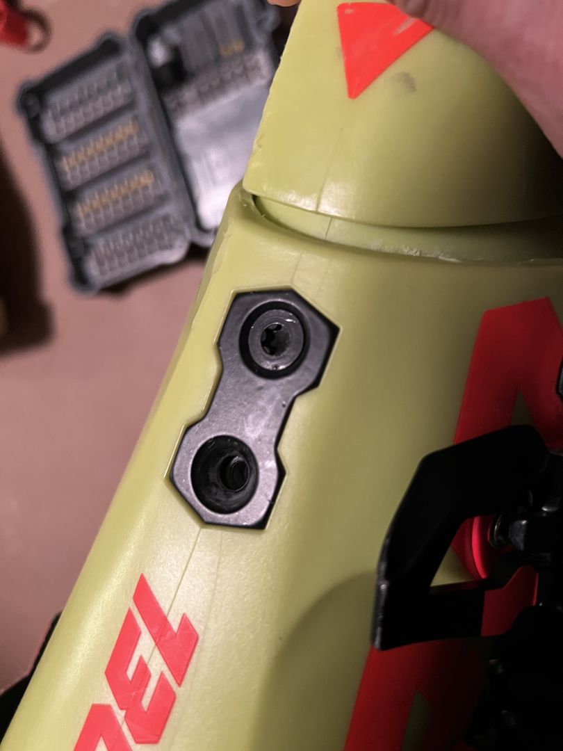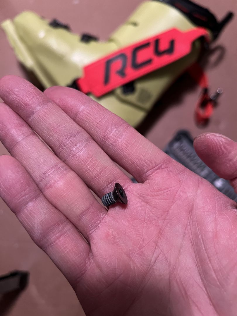 Ein der zwei Schrauben hinter dem Stiefel ist verloren gegangen, ich konnte nicht herausfinden, was für Schrauben die sind. Vermute mal das die M6 sind.