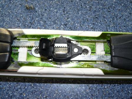 2 Schrauben in der Bindung waren leider ausgerissen... Zentral in der Bindung (ELX 12) ist ja das Schloss, welches vorderen und Hinteren Backen über Zahnstangen verbindet. Dieses Schloss ist mit 2 Schrauben im Ski verschraubt. Ohne diese Schrauben können Vordere und Hinterer Backen (miteinander) auf der Bindungsschiene nach vorne oder hinten geschoben werden.