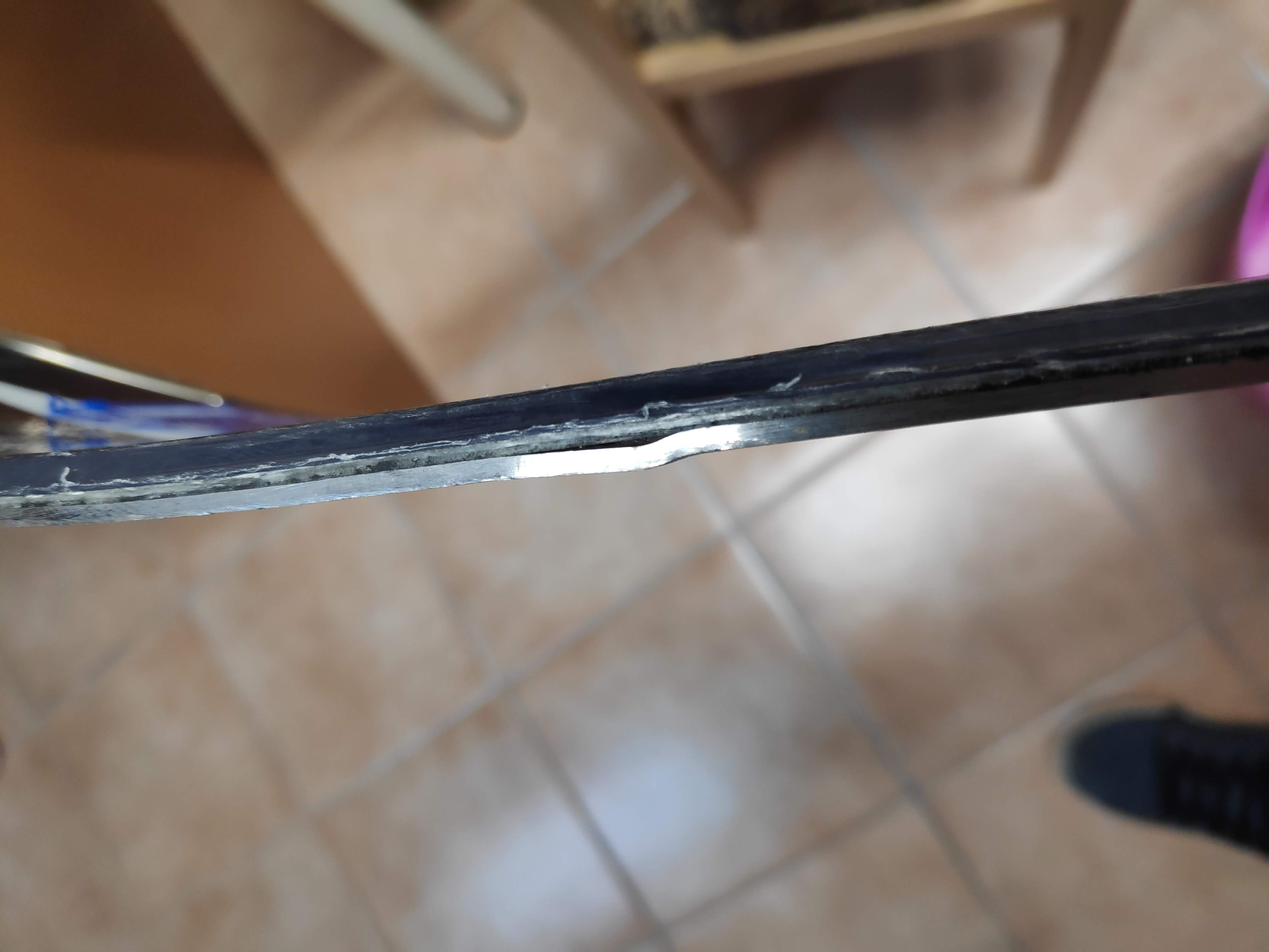 mir ist bei der letzten Skifahrt heuer leider ein kleines Missgeschick passiert: Mir ist die Kante des einen Skis auf den Belag des anderen gefallen. Das Ergebnis seht ihr hier im Anhang.
