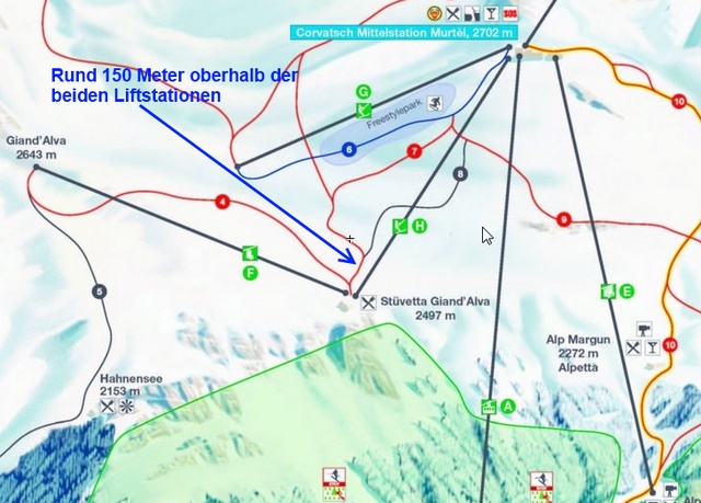 Ich bräuchte ein paar Fotos von einer Abfahrt am Corvatsch. Und zwar geht es um die im Bild gekennzeichnete Stelle auf der Abfahrt 7, etwa 150 meter oberhalb der beiden Liftstationen.