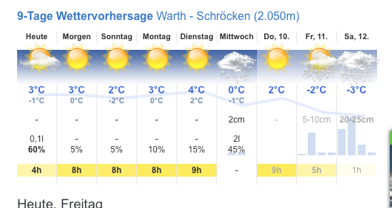 Gerade die Wettervorhersage für den Freitag und den (Anreise)Samstag gesehen. Wenn sich das so ausgeht, dann haben wir alles richtig gemacht.