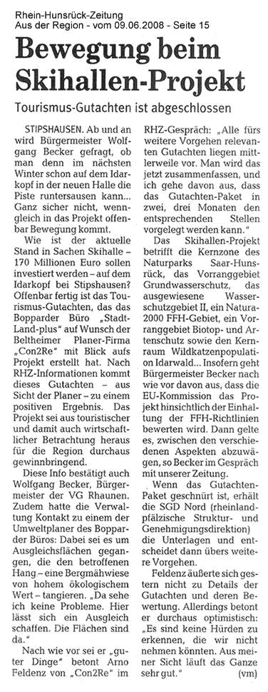 Schneider hofft jedoch, dass von 2009 an die ersten Gäste die Skihalle am Idarkopf nutzen können. «Es herrscht hier eine ganz andere Zusammenarbeit mit den Kommunen», gibt er zur Begründung an. Jährlich sollen nach den Firmenplänen 540 000 Besucher die Halle nutzen, «bei einem durchschnittlichen Besuch von zwei Stunden». Hinzu kämen nochmals 100 000 bis 200 000 Gäste im Freizeitpark und dem Feriendorf, das mit «urig komfortablen Drei- und Vier-Sterne-Häusern im Hunsrückstil» aufwarten werde.