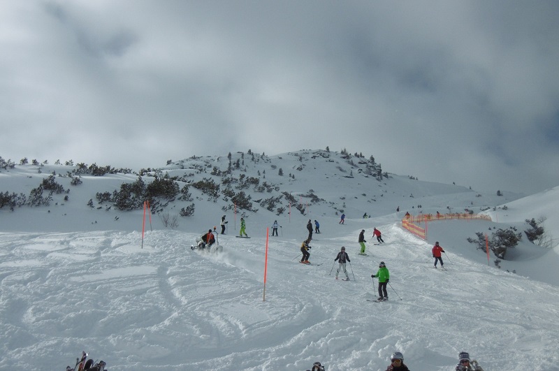 Eine kleinere Gruppe, von lediglich einer Lehrerin befehligt, ergriff dann die Initiative und bewegte sich teils parallel teils im Zick-Zack durch die Truppe hindurch. Irgendwie löste sich dann dieses Knäuel auf und beide Gruppen strebten dem Sonnenlift zu. Dort wurde dann der Zugang mit wartenden Schülern blockiert, weil die Mädchen nach dieser langen Abfahrt erstmal aufs WC mussten.