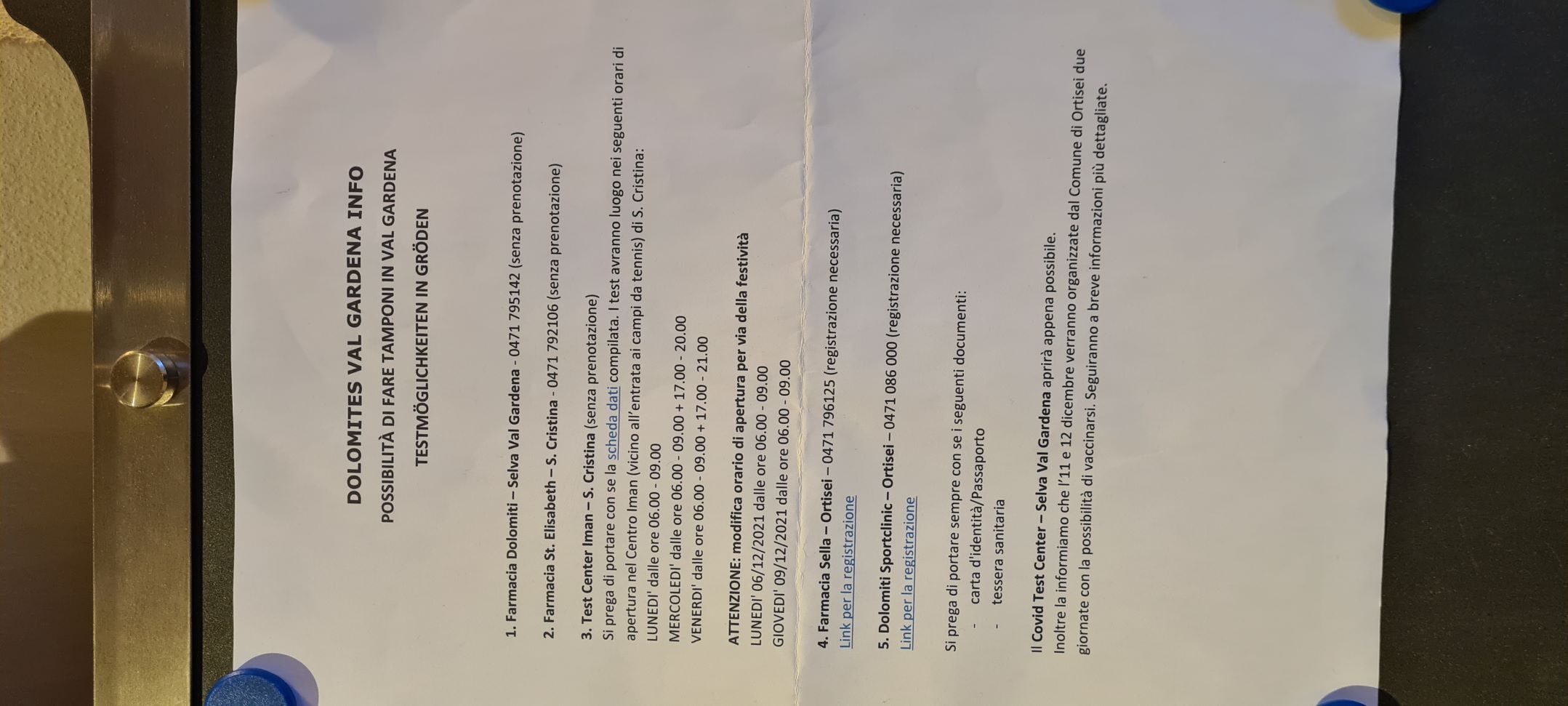 Nachfolgend eine Liste von Teststationen im Grödner Tal zur Info..man beachte die Öffnungszeiten: