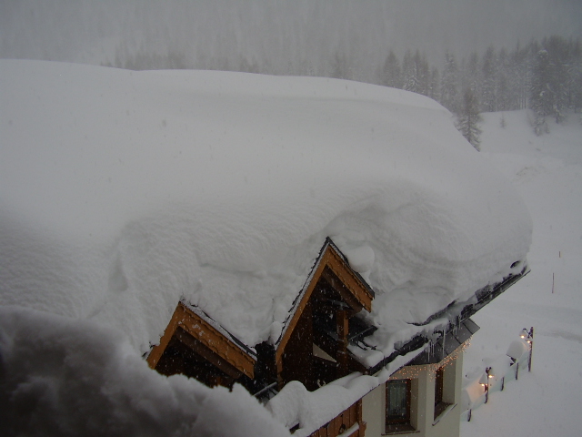 Heute hat es ohne Unterlass geschneit. Die ersten Dachlawinen sind abgerauscht. Immer dann wenn die fleissigen Hausmeister / Kellner und weitere Hilfskraefte meinten fertig zu sein, rutschten ihnen vom Dach 5 Kubikmeter runter.