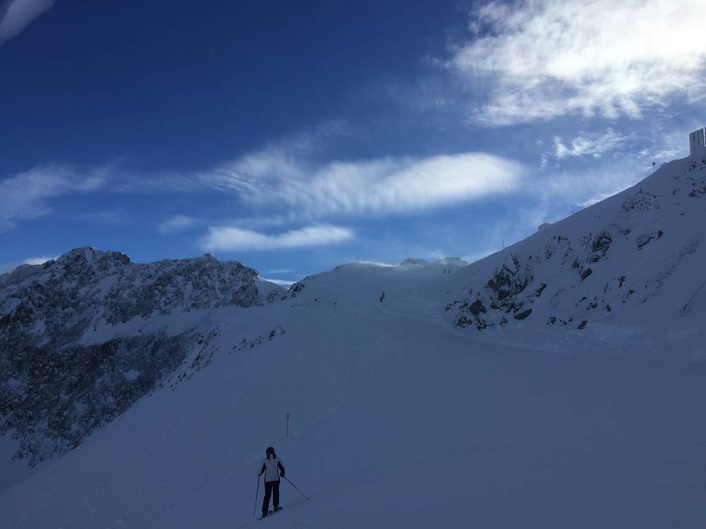 Kaiserwetter und alle Bahnen liefen am Hochjoch. Nachts hatte Frau Holle eine Sonderschicht eingelegt und die Pisten mit 30 cm Powder versorgt. Es war wieder sehr überschaubar auf den Pisten und es gab keine Wartezeiten an Bahnen und Liften. Allerdings nahm der Wind langsam aber sicher im Laufe des Tages zu, aber ein Nordlicht beeindruckte dies "noch" nicht. Das sollte sich aber schon bald ändern!