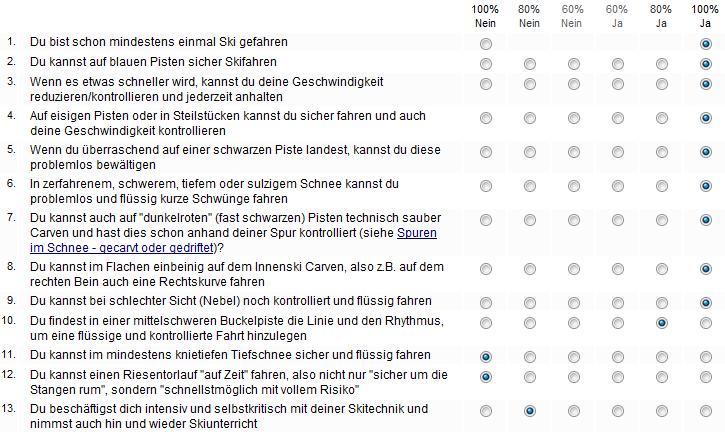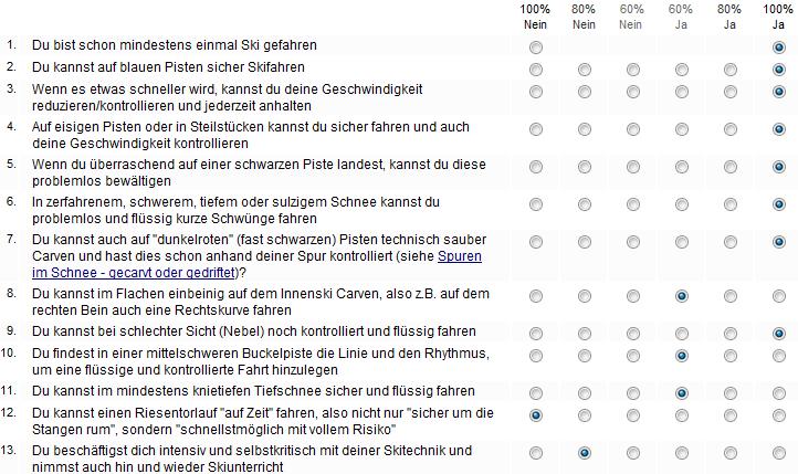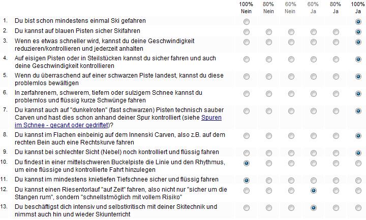 o doch, das unten (keine Buckelpiste, kein Tiefschnee, keine ernsthaften Rennen) ergibt z.B. Level 78 (was mich am Sinn der Punktewertung doch stark zweifeln lässt)urs hat geschrieben:agressives carven mit "hand-im-schnee" und ski-level 77 gehen für mich nicht zusammen
