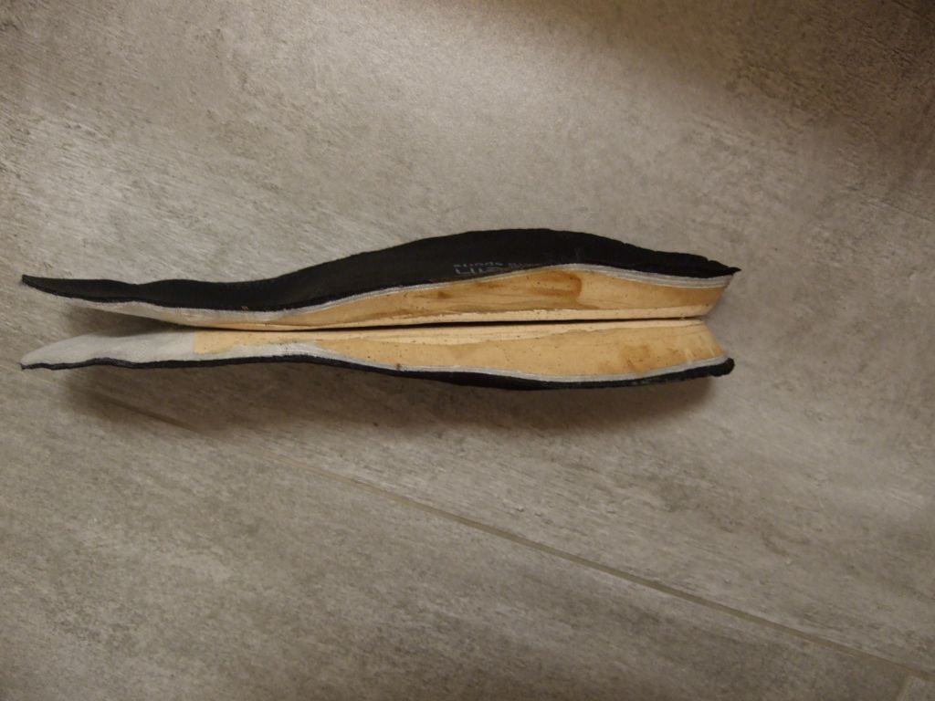 Im Prinzip besteht die Sohle aus einer konventionellen thermisch verformbaren Einlage, die auf einem Vakuumkissen angepasst wird. Anschließend wurde nach meinen Vorgaben die Sohle vollflächig mit 55er Kork unterfüttert und dabei die Ferse um ca. 10mm angehoben. Damit habe ich am Rist und an der Ferse optimalen Kontakt zum Schuh und der Knöchel sitzt auch an der werksseitig vorgesehenen Stelle. Das Maß von 10mm hatte ich zuvor durch eigene Versuche mit Aufdoppelungen bestimmt. Als Prototyp hatte ich eine selbst gebackene Sohle von Superfeet verwendet, um damit das grundsätzliche Konzept zu testen.