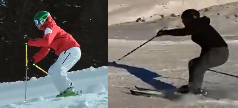 sorry, ich meinte bei sek. 48 (hab die falsche zahl erwischt). ein ähnliches bild zeigt sich bei sek. 30. ich hab einen vergleich mit einer dsv-fahrerin zusammengestellt. hier siehst du schön, dass bei dir das äussere schienbein senkrecht steht und oberkörper und arme stark nach vorne greifen. das innere knie scheint gut angewinkelt, was vermutlich von der besagten verdrehung der hüfte herrührt. als erstes würde ich das gesamtsystem aufrichten und von da aus eine bessere balance suchen und ruhe ins system bringen.