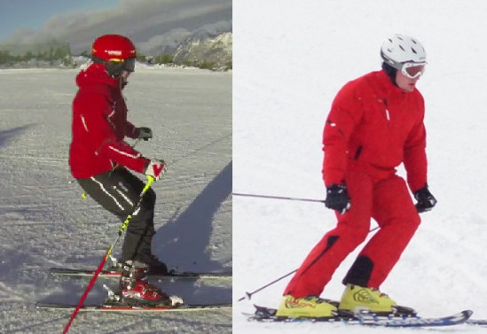 Ich nehme mal an er meint das so ungefähr - vergleich einfach mal die Bilder und schau wie tief unten (und vor allem hinten) dein Hintern ist. Die Position auf dem anderen Foto ist zwar auch nicht perfekt (vor allem der Blick ist zu stark nach unten gerichtet) gibt dir aber einen guten Vergleich wie eine neutrale Position über dem Ski aussehen könnte.