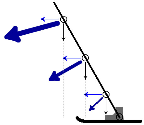 Beim Skifahren bewegt man sich auch (gewollt oder ungewollt) vor und zurück (dünne blaue Pfeile). Je höher der Körperschwerpunkt, desto größer der Hebel (dicke blaue Pfeile), desto stärker der Einfluß auf den Ski.