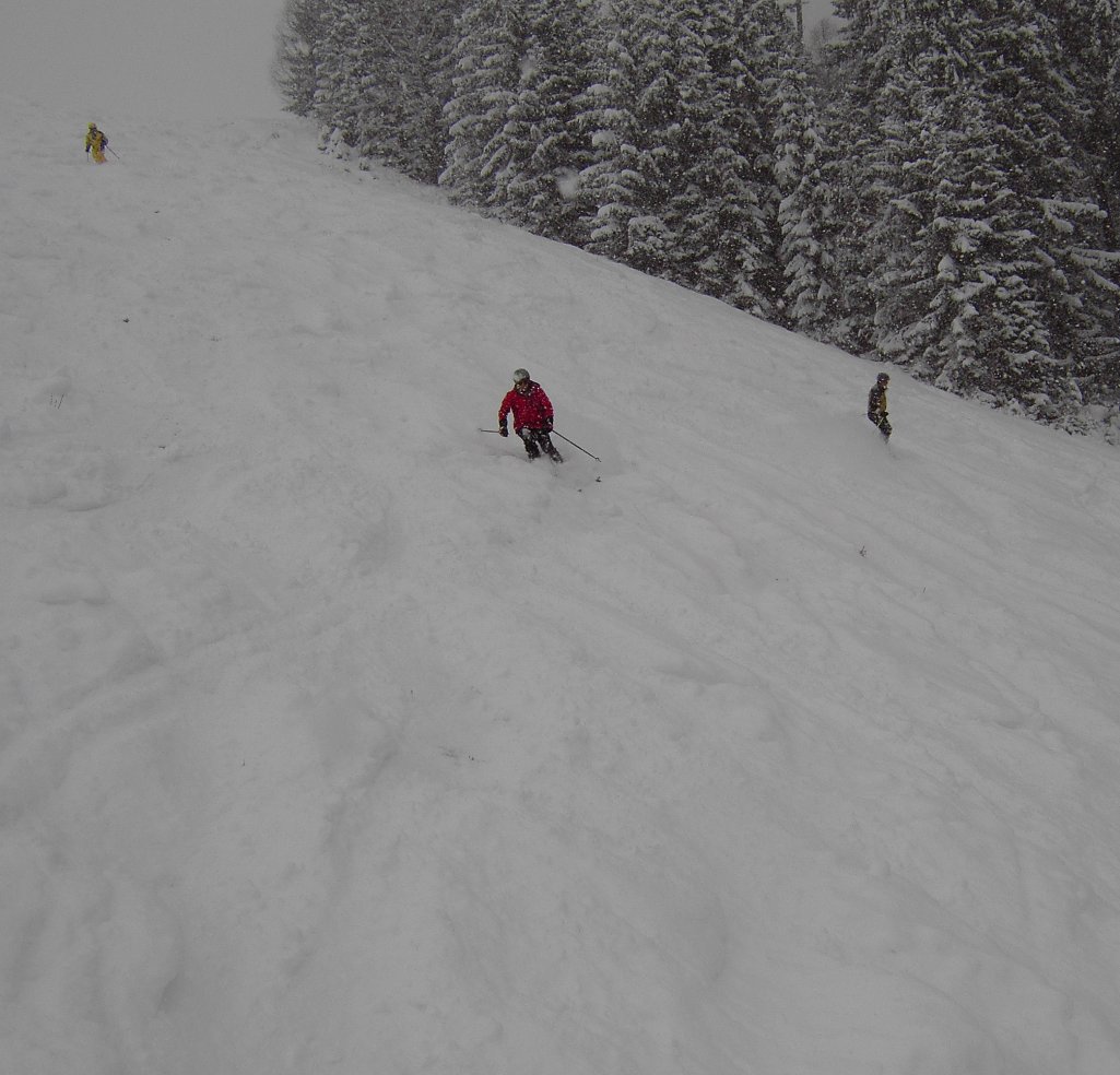 Im Anhang: Völkl Racetiger im Tiefschnee, ich bin der rote.