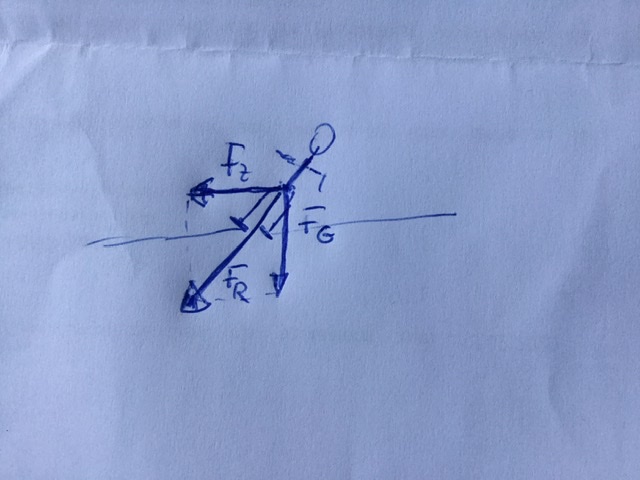 ^Frontansicht, Skifahrer in Kurvenfahrt mit Gewichtskraft FG, Zentrifugalkraft Fz und der aus beiden Kräften resultierenden Kraft FR als Ergebnis der Vektorsumme aus Fz und FG