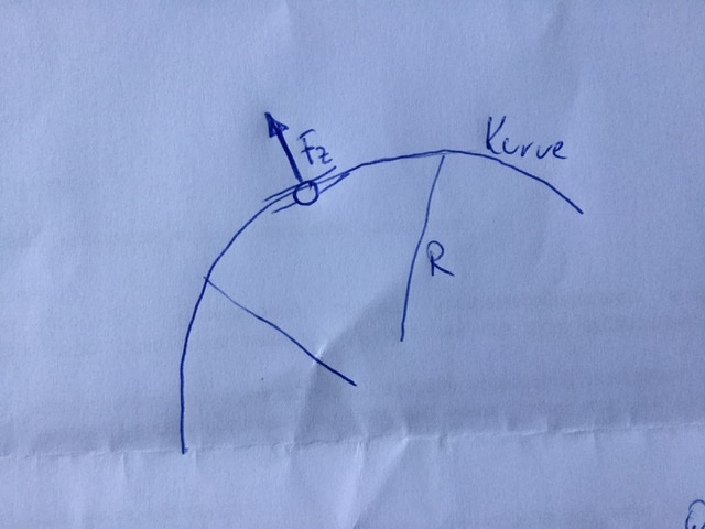 ^Draufsicht, Skifahrer in Kurvenfahrt mit Radius R, Zemtrifugalkraft Fz