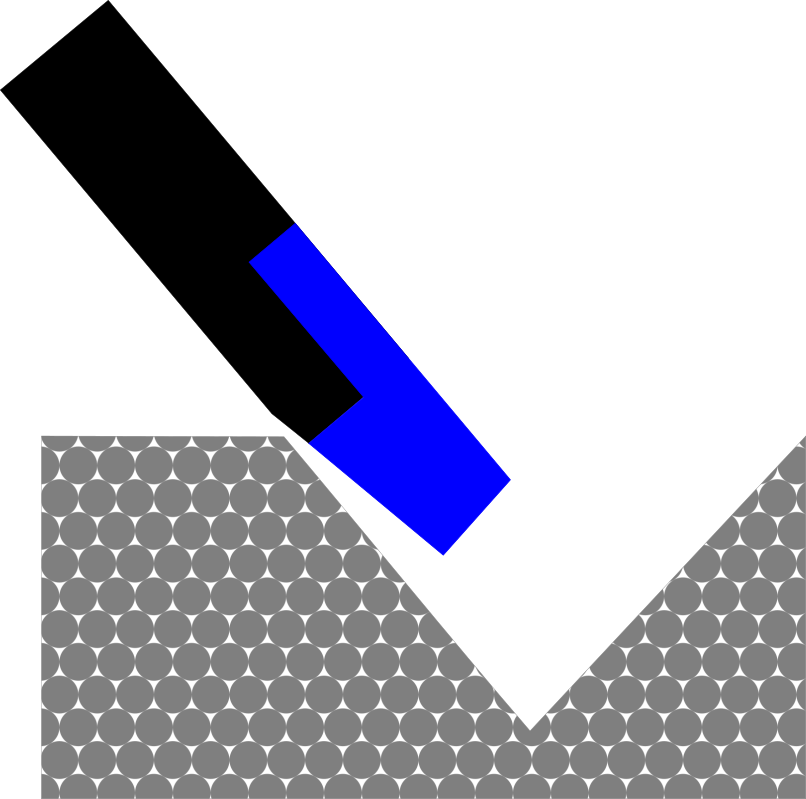 Bei werden zwei Flächen aufeinander gepresst, teilt sich die Kraft in eine zur Kontaktfläche senkrechte Kraft Fs, die quasi für das abpressen sorgt und eine zur Kontaktfläche Parallele Kraft Fp. Hier im dem Fall sieht man, dass Fp nach unten gerichtet ist, und dafür sorgt, dass unsere Kante in den Untergrund schneidet.