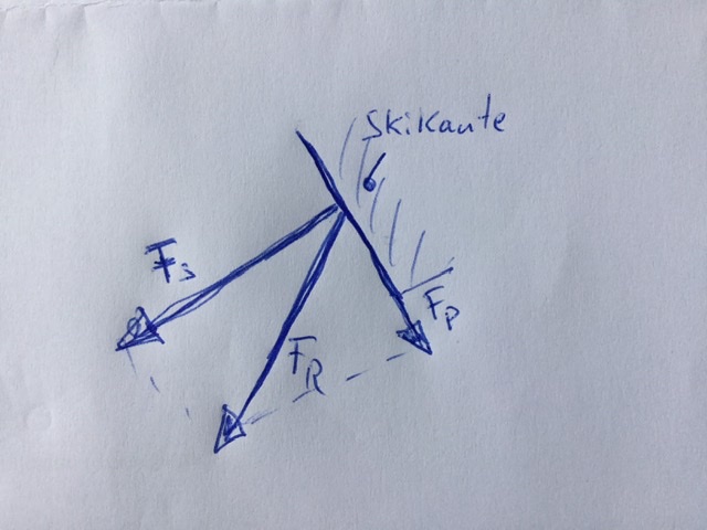 Im Ergebnis wirkt also eine Kraft FR auf unseren Skifahrer (vereinfacht, die Hangabtriebskraft und Reibungskräfte und noch einige weitere interessieren uns hier mal nicht). Diese Kraft müssen die Ski nun auch in den Untergrund übertragen, sie sind ja der einzige Kontaktpunkt.