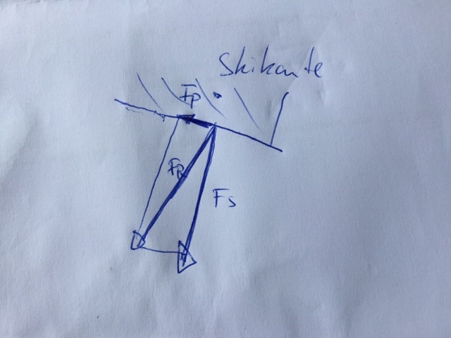 Bei Null Grad Abhängung haben wir deswegen das Gefühl, die Ski würden verkanten, weil wir im „mühelosen“ weil querkraftfreien Zustand bereits den Übergang von Zustand 2.) zu 1.) haben. Je größer die Abhängung, desto mehr müssen wir bewusst dafür tun, die Kanten zum Schneiden zu bringen. Es kostet Kraft, nämlich mindestens den Betrag vom Fp, was wir als Querkraft spüren.