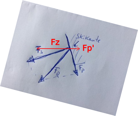 Fz will den Ski driften lassen. Fp' ist die horizontale Komponente Deines Fp, welches den Ski zurückhalten soll. Dummerweise wird Fp' mit zunehmenden Aufkantwinkel kleiner statt größer. Hättest Du einmal Dir die Mühe gemacht, alle Kräfte in Deinen Zeichnungen korrekt einzutragen, dann wäre Dir dies sicherlich sofort aufgefallen.