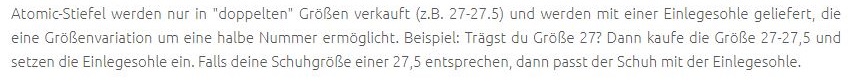 Im Onlineshop wurde bei den Skischuhen darauf hingewiesen, dass die Schuhe in "doppelter Größe" verkauft werden und mit den mitgelieferten Einlagesohlen eine Größenvariation um eine halbe Nummer ermöglicht wird (siehe Dateianhang).